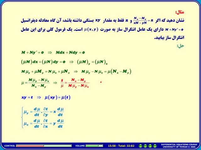 که اين معادله بايد يک معادله ديفرانسيل کامل باشد ، پس بايد در شرايط صدق کند .